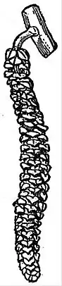 Fig. 13.—Amentum or catkin of Hazel (Corylus Avellana), consisting of an axis or rachis covered with bracts in the form of scales, each of which covers a male flower, the stamens of which are seen projecting beyond the scale. The catkin falls off in a mass, separating from the branch by an articulation. | ||