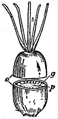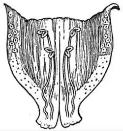 The ovule is attached to the placenta, and destined to become the seed. Ovules are most usually produced on the margins of the carpellary leaves, but are also formed over the whole surface of the leaf, as in Butomus. In other instances they rise The ovule. from the floral axis itself, either terminal, as in Polygonaceae and Piperaceae, or lateral, as in Primulaceae and Compositae. The ovule is usually contained in an ovary, and all plants in which the ovule is so enclosed are termed angiospermous; but in Coniferae and Cycadaceae it has no proper ovarian covering, and is called naked, these orders being denominated gymnospermous. In Cycas the altered leaf, upon the margin of which the ovule is produced, and the peltate scales, from which they are pendulous in Zamia, are regarded by all botanists as carpellary leaves. As for the Coniferae great discussion has arisen regarding the morphology of parts in many genera. The carpellary leaves are sometimes united in such a way as to leave an opening at the apex of the pistil, so that the ovules are exposed, as in mignonette. In Leontice thalictroides (Blue Cohosh), species of Ophiopogon, Peliosanthes and Stateria, the ovary ruptures immediately after flowering, and the ovules are exposed; and in species of Cuphea the placenta ultimately bursts through the ovary and corolla, and becomes erect, bearing the exposed ovules. The ovule is attached to the placenta either directly, when it is sessile, or by means of a prolongation funicle (fig. 110, f). This cord sometimes becomes much elongated after fertilization. The part by which the ovule is attached to the placenta or cord is its base or hilum, the opposite extremity being its apex. The latter is frequently turned round in such a way as to approach the base. The ovule is sometimes embedded in the placenta, as in Hydnora.