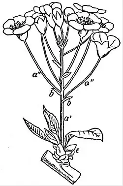 Fig. 11.—Corymb of Cerasus Mahaleb, terminating an abortive branch, at the base of which are modified leaves in the form of scales, e. a′, Primary axis; a″, secondary axes bearing flowers; b, bract in the axils of which the secondary axes arise. | ||