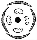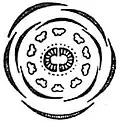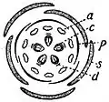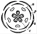 Fig. 23.—Diagram of a completely symmetrical flower, consisting of four whorls, each of five parts, s, Sepals; p, petals; a, stamens; c, carpels. | |||||||||||||||