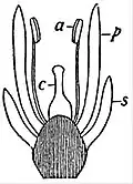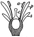 Fig. 22.—Flower of Sedum rubens. s, Sepals; p, petals; a, stamens; c, carpels. | |||||||||||||||