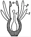 The flower consists of the floral axis bearing the sporophylls (stamens and carpels), usually with certain protective envelopes. The axis is usually very much contracted, no internodes being developed, and the portion bearing the floral leaves, termed the thalamus or torus, frequently The flower. expands into a conical, flattened or hollowed expansion; at other times, though rarely, the internodes are developed and it is elongated. Upon this torus the parts of the flower are arranged in a crowded manner, usually forming a series of verticils, the parts of which alternate; but they are sometimes arranged spirally especially if the floral axis be elongated. In a typical flower, as in fig. 22, we recognize four distinct whorls of leaves: an outer whorl, the calyx of sepals; within it, another whorl, the parts alternating with those of the outer whorl, the corolla of petals; next a whorl of parts alternating with the parts of the corolla, the androecium of stamens; and in the centre the gynoecium of carpels. Fig. 23 is a diagrammatic representation of the arrangement of the parts of such a flower; it is known as a floral diagram. The flower is supposed to be cut transversely, and the parts of each whorl are distinguished by a different symbol. Of these whorls the two internal, forming the sporophylls, constitute the essential organs of reproduction; the two outer whorls are the protective coverings or floral envelopes. The sepals are generally of a greenish colour; their function is mainly protective, shielding the more delicate internal organs before the flower opens. The petals are usually showy, and normally alternate with the sepals. Sometimes, as usually in monocotyledons, the calyx and corolla are similar; in such cases the term perianth, or perigone, is applied. Thus, in the tulip, crocus, lily, hyacinth, we speak of the parts of the perianth, in place of calyx and corolla, although in these plants there is an outer whorl (calyx), of three parts, and an inner (corolla), of a similar number, alternating with them. When the parts of the calyx are in appearance like petals they are said to be petaloid, as in Liliaceae. In some cases the petals have the appearance of sepals, then they are sepaloid, as in Juncaceae. In plants, as Nymphaea alba, where a spiral arrangement of the floral leaves occurs, it is not easy to say where the calyx ends and the corolla begins, as these two whorls pass insensibly into each other. When both calyx and corolla are present, the plants are dichlamydeous; when one only is present, the flower is termed monochlamydeous or apetalous, having no petals (fig. 24). Sometimes both are absent, when the flower is achlamydeous, or naked, as in willow. The outermost series of the essential organs, collectively termed the androecium, is composed of the microsporophylls known as the staminal leaves or stamens. In their most differentiated form each consists of a stalk, the filament (fig. 25, f), supporting at its summit the anther (a), consisting of the pollen-sacs which contain the powdery pollen (p), the microspores, which is ultimately discharged therefrom. The gynoecium or pistil is the central portion of the flower, terminating the floral axis. It consists of one or more carpels (megasporophylls), either separate (fig. 22, c) or combined (fig. 24). The parts distinguished in the pistil are the ovary (fig. 26, o), which is the lower portion enclosing the ovules destined to become seeds, and the stigma (g), a portion of loose cellular tissue, the receptive surface on which the pollen is deposited, which is either sessile on the apex of the ovary, as in the poppy, or is separated from it by a prolonged portion called the style (s). The androecium and gynoecium are not present in all flowers. When both are present the flower is hermaphrodite; and in descriptive botany such a flower is indicated by the symbol ☿. When only one of those organs is present the flower is unisexual or diclinous, and is either male (staminate), ♁; or female (pistillate), ♀. A flower then normally consists of the four series of leaves—calyx, corolla, androecium and gynoecium—and when these are all present the flower is complete. These are usually densely crowded upon the thalamus, but in some instances, after apical growth has ceased in the axis, an elongation of portions of the receptacle by intercalary growth occurs, by which changes in the position of the parts may be brought about. Thus in Lychnis an elongation of the axis betwixt the calyx and the corolla takes place, and in this way they are separated by an interval. Again, in the passion-flower (Passiflora) the stamens are separated from the corolla by an elongated portion of the axis, which has consequently been termed the androphore, and in Passiflora also, fraxinella (fig. 27), Capparidaceae, and some other plants, the ovary is raised upon a distinct stalk termed the gynophore; it is thus separated from the stamens, and is said to be stipitate. Usually the successive whorls of the flower, disposed from below upwards or from without inwards upon the floral axis, are of the same number of parts, or are a multiple of the same number of parts, those of one whorl alternating with those of the whorls next it.