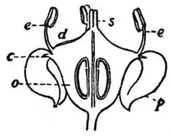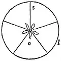 Fig. 93.—Diagrammatic section of a quinquelocular ovary, composed of five carpels, the edges of which are folded inwards, and meet in the centre forming the septa, s. The ovules (o) are attached to a central placenta, formed by the union of the five ventral sutures. Dorsal suture, l. | ||