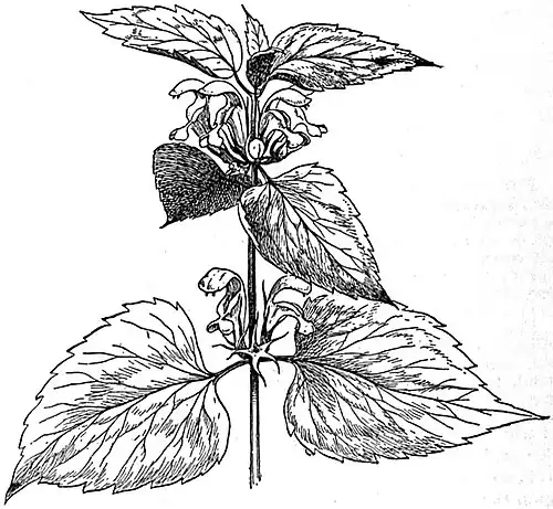Fig. 17.—Flowering stalk of the White Dead-nettle (Lamium album). The bracts are like the ordinary leaves of the plant, and produce clusters of flowers in their axil. The clusters are called verticillasters, and consist of flowers which are produced in a centrifugal manner. |