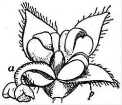 Fig. 83.—Male flower of Pellitory (Parietaria officinalis), having four stamens with in-curved elastic filaments, and an abortive pistil in the centre. When the perianth (p) expands, the filaments are thrown out with force as at a, so as to scatter the pollen. | |