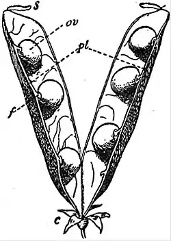 Fig. 91.—Pistil of Pea after fertilization of the ovules, developing to form the fruit. f, Funicle or stalk of ovule (ov); pl, placenta; s, withered style and stigma; c, persistent calyx. | |