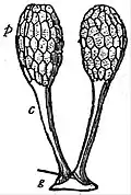 Fig. 78.—Pollinia, or pollen-masses, with their retinacula (g) or viscid matter attaching them at the base. The pollen masses (p) are supported on stalks or caudicles (c). These masses are easily detached by the agency of insects. Much enlarged. | ||