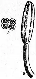Fig. 70.—Quadrilocular or tetrathecal anther of the flowering Rush (Butomus umbellatus). The anther entire (a) with its filament; section of anther (b) showing the four loculi. | |