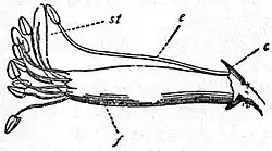 Fig. 103.—Gynoecium of the Flower-de-Luce (Iris), consisting of an inferior ovary (o) and a style which divides into three petaloid segments (s), each bearing a stigma (st). | ||