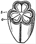 Fig. 92.—Trilocular ovary of the Lily (Lilium), cut transversely. s, Septum; o, ovules, which form a double row in the inner angle of each chamber. Enlarged. | ||