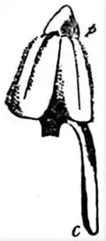 | Fig. 113.—Vertical section of the ovule of the Scotch Fir (Pinus sylvestris) in May of the second year, showing the enlarged embryo-sac b, full of endosperm cells, and pollen-tubes c, penetrating the summit of the nucellus after the pollen has entered the large micropyle. |