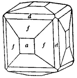 Fluor-spar crystallizes in the cubic system, commonly in cubes, either alone or combined with the octahedron, rhombic dodecahedron, four-faced cube, &c. The four-faced cube has been called the fluoroid. In fig. 1, a is the cube (100), d the rhombic dodecahedron (110), and f the four-faced cube (310). Fig. 2 shows a characteristic twin of interpenetrant cubes. The crystals are sometimes polysynthetic, a large octahedron, e.g., being built up of small cubes. The faces are often etched or corroded. Cleavage is nearly always perfect, parallel to the octahedron.