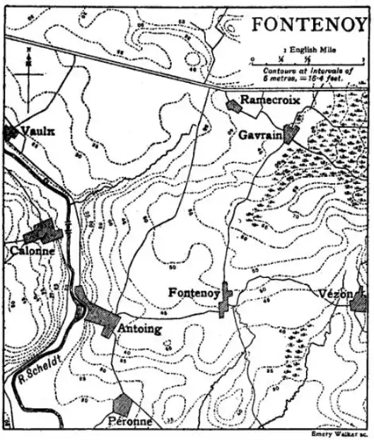 FONTENOY, a village of Belgium, in the province of Hennegau, about 4 m. S.E. of Tournai, famous as the scene of the battle of Fontenoy, in which on the 11th of May 1745 the French army under Marshal Saxe defeated the Anglo-Allied army under the duke of Cumberland. The object of the French (see also Austrian Succession, War of the) was to cover the siege of the then important fortress of Tournai, that of the Allies, who slowly advanced from the east, to relieve it. Informed of the impending attack, Louis XV., with the dauphin, came with all speed to witness the operations, and by his presence to give Saxe, who was in bad health and beset with private enemies, the support necessary to enable him to command effectively. Under Cumberland served the Austrian field-marshal Königsegg, and, at the head of the Dutch contingent, the prince of Waldeck.