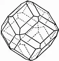 All garnets crystallize in the cubic system, usually in rhombic dodecahedra or in icositetrahedra, or in a combination of the two forms (see fig.). Octahedra and cubes are rare, but the six-faced octahedron occurs in some of the combinations. Cleavage obtains parallel to the dodecahedron, but is imperfect. The hardness varies according to composition from 6.5 to 7.5, and the specific gravity in like manner has a wide range, varying from 3.4 in the calcium-aluminium garnets to 4.3 in the ferrous-aluminium species. Sir Arthur H. Church found that many garnets when fused yielded a product of lower density than the original mineral. The colour is typically red, but may be brown, yellow, green or even black, while some garnets are colourless. Being cubic the garnets are normally singly refracting, but anomalies frequently occur, leading some authorities to doubt whether the mineral is really cubic. The refractive power of garnet is high, so that in microscopic sections, viewed by transmitted light, the mineral stands out in relief.
