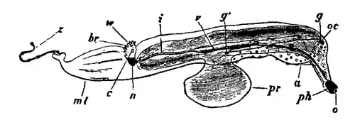 | ln, rn, | Primarily left nephridium and primarily right nephridium. | bucc, | Buccal mass. |