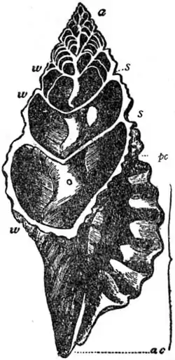 The problem of the causes of the torsion of the Gastropod body has been much discussed. E. R. Lankester in the ninth edition of this work attributed it to the pressure of the shell and visceral hump towards the right side. He referred also to the nautiloid shell of the larva falling to one side. But these are two distinct processes. In the larva a nautiloid shell is developed which is coiled exogastrically, that is, dorsally, and the pallial cavity is posterior or ventral (fig. 2, C): the larva therefore resembles Nautilus in the relations of body and shell. The shell then rotates towards the left side through 180°, so that it becomes ventral or endogastric (fig. 2, D). The pallial cavity, with its organs, is by this torsion moved up the right side of the larva to the dorsal surface, and thus the left organs become right and vice versa. In the subsequent growth of the shell the spire comes to project on the right side, which was originally the left. Neither the rotation of the shell as a whole nor its helicoid spiral coiling is the immediate cause of the torsion of the body in the individual, for the direction of the torsion is indicated in the segmentation of the ovum, in which there is a complete reversal of the cleavage planes in sinistral as compared with dextral forms. The facts, however, strongly suggest that the original cause of the torsion was the weight of the exogastric shell and visceral hump, which in an animal creeping on its ventral surface necessarily fell over to one side. It is not certain that the projection of the spire to the originally left side of the shell has anything to do with the falling over of the shell to that side. The facts do not support such a suggestion. In the larva there is no projection at the time the torsion takes place. In some forms the coiling disappears in the adult, leaving the shell simply conical as in Patellidae, Fissurellidae, &c., and in some cases the shell is coiled in one plane, e.g. Planorbis. In all these cases the torsion and asymmetry of the body are unaffected.