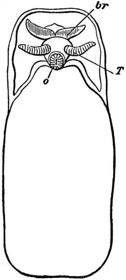The foot now protrudes below the mouth, and the post-oral hemisphere of the trochosphere grows more rapidly then the anterior or velar area. The young foot shows a bilobed form. Within the velar area the eyes and the cephalic tentacles commence to rise up, and on the surface of the post-oral region is formed a cap-like shell and an encircling ridge, which gradually increases in prominence and becomes the freely depending mantle-skirt. The outline of the velar area becomes strongly emarginated and can be traced through the more mature embryos to the cephalic lobes or labial processes of the adult Limnaeus (fig. 61).