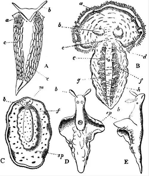 - Fam. 5.—Limapontiidae. No lateral expansions, and no dorsal papillae; body planariform; anus dorsal, median and posterior. Limapontia, British. Actaeonia, British. Cenia.