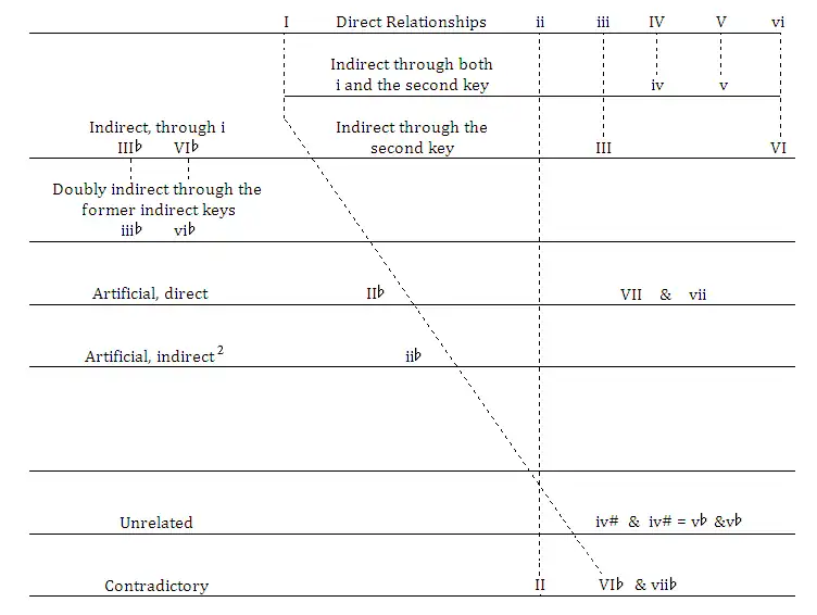 d. Contrary and Unconnected Keys.—There remain only two pairs of keys that classical music has not brought into connexion, a circumstance which has co-operated with the utter vagueness of orthodox theories on the subject to confirm the conventionally progressive critic in his conviction that all modulations are alike. We have seen how the effect of modulation from major tonic to minor supertonic is, on a large scale, obscured by the identity of the primary dominant with the secondary subdominant, though the one chord is major and the other minor. Now when the supertonic becomes major this difference no longer obviates the confusion, and modulation from C major to D major, though extremely easy, is of so bewildering effect that it is used by classical composers only in moments of intensely dramatic surprise, as, for example, in the recapitulation of the first subject of Beethoven’s Eroica Symphony, and the last variation (or coda) of the slow movement of his Trio in B♭, Op. 97. And in both cases the balance is restored by the converse (and equally if not more contradictory) modulation between major tonic and major flat 7th, though in the slow movement of the B♭ Trio the latter is represented only by its dominant chord which is “enharmonically” resolved into quite another key. The frequent attempts made by easy-going innovators to treat these key-contrasts on another footing than that of paradox, dramatic surprise or hesitation, only show a deficient sense of tonality, which must also mean an inability to see the intensely powerful effect of the true use of such modulations in classical music, an effect which is entirely independent of any ability to formulate a theory to explain it.[6] There now remains only one pair of keys that have never been related, namely, those that (whether major or minor) are at the distance of a tritone 4th. In the first place they are unrelated because there is no means of putting any form of a tonic chord of F♯ into any form of the key of C, or vice versa; and in the second place because it is impossible to tell which of two precisely opposite keys the second key may be (e.g. we have no means of knowing that a direct modulation from C to F♯ is not from C to G♭, which is exactly the same distance in the opposite direction). And this brings us to the only remaining subjects of importance in the science and art of harmony, namely, those of the tempered scale, enharmonic ambiguity and just intonation. Before proceeding we subjoin a table of all the key-relationships from major and minor tonics, representing the degrees by capital Roman figures when the second key is major and small figures when minor. Thus I represents tonic major, iv represents subdominant minor, and so on. A flat or a sharp after the figure indicates that the normal degree of the standard scale has been lowered or raised a semitone, even when in any particular pair of keys it would not be expressed by a flat or a sharp. Thus vi♭ would, from the tonic of B♭ major, express the position of the slow movement of Beethoven’s Sonata, Op. 106, which is written in F♯ minor since G♭ minor is beyond the practical limits of notation.