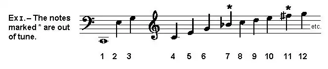 10. The perfect concords and perfect intervals are those comprised within the first four members of the harmonic series, namely, the octave, as between numbers 1 and 2 of the series (see Ex. 1 above); the 5th, as between Nos. 2 and 3; and the 4th, as between Nos. 3 and 4.