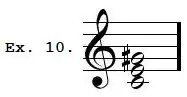 | Ex. 12.—Three concords (ionic, first inversion of subdominant, and dominant of A minor, a possible 16th-century cadence in the Phrygian mode). | ![]() |