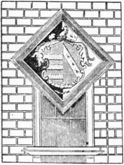 If for a bachelor the hatchment bears upon a shield his arms, crest, and other appendages, the whole on a black ground. If for a single woman, her arms are represented upon a lozenge, bordered with knotted ribbons, also on a black ground. If the hatchment be for a married man (as in the illustration), his arms upon a shield impale those of his surviving wife; or if she be an heiress they are placed upon a scutcheon of pretence, and crest and other appendages are added. The dexter half of the ground is black, the sinister white. For a wife whose husband is alive the same arrangement is used, but the sinister ground only is black. For a widower the same is used as for a married man, but the whole ground is black; for a widow the husband’s arms are given with her own, but upon a lozenge, with ribbons, without crest or appendages, and the whole ground is black. When there have been two wives or two husbands the ground is divided into three parts per pale, and the division behind the arms of the survivor is white. Colours and military or naval emblems are sometimes placed behind the arms of military or naval officers. It is thus easy to discern from the hatchment the sex, condition and quality, and possibly the name of the deceased.