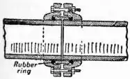 There are several joints in general use for the best class of work which are formed with the aid of india-rubber rings or collars, any expansion being divided amongst the whole number of joints. In the rubber ring joint an india-rubber ring is used; slightly less in diameter than the pipe. The rubber is circular in section, and about 1/2 in. thick, and is stretched on the extreme end of a pipe which is then forced into the next socket. This joint is durable, secure and easily made; it allows for expansion and by its use the risk of pipe sockets being cracked is avoided. It is much used for greenhouse heating works. Richardson’s patent joint (fig. 9) is a good form of this class of joint. The pipes have specially shaped ends between which a rubber collar is placed, the joint being held together by clips. The result is very satisfactory and will stand heavy water pressure. Messenger’s joint (fig. 10) is designed to allow more freedom of expansion and at the same time to withstand considerable pressure; one loose cast iron collar is used, and another is formed as a socket on the end of the pipe itself. One end of each pipe is plain, so that it may be cut to any desired length; pipes with shaped ends obviously must be obtained in the exact lengths required. Jones’s expansion joint (fig. 11) is somewhat similar to Messenger’s but it is not capable of withstanding so great a pressure. In this case both collars of cast iron are loose.