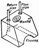 Two classes of boilers are chiefly used in hot-water heating installations, viz. those heated by the fire of the kitchen range, and those heated separately or independently. Of the first class there are two varieties in common use—a form of “saddle” boiler (fig. 13) and the “boot” boiler Boilers. (fig. 14). Independent boilers are made in every conceivable size and form of construction, and many of them are capable of doing excellent work. In the choice of a boiler of this description it should be remembered that rapid heating, economical combustion of fuel, and facilities for cleaning, are requisites, the absence of any of which considerably lowers the efficiency of the apparatus. Boilers set in brickwork are sometimes used in domestic work, although they are more favoured for horticultural heating. The shape mostly used is the “saddle” boiler, or some variation upon this very old pattern. The coiled pipe fire-box of the high-pressure hot-water system previously described may be also classed with boilers.
