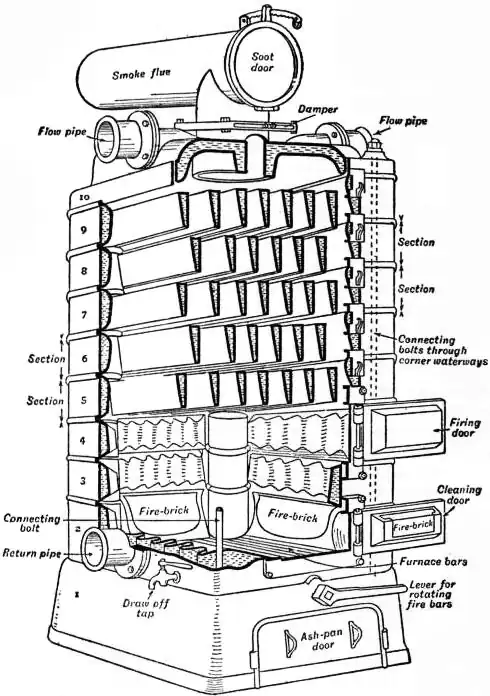 A notable feature of modern boiler construction is the mode of building the apparatus of cast iron in either horizontal or vertical sections. Both the types intended to be set in brickwork and those working independently are formed on the sectional principle, which has many good points. The parts are easy of transport and can be handled without difficulty through narrow doorways and in confined situations. The size of the boiler may be increased or diminished by the addition or subtraction of one or more sections; these, being simple in design, are easily fitted together, and should a section become defective it is a simple matter to insert a new one in its place. Should a defect occur with a wrought iron boiler it is usually necessary for the purpose of repair to disconnect and remove the whole apparatus, the heating system of which it forms a part being in the meantime useless. In a type built with vertical sections each division is complete in itself, and is not directly connected with the next section, but communicates with flow and return drums. A defective section may thus be left in position and stopped off by means of plugs from the drums until it is convenient to fit a new one in its place. A boiler with horizontal sections is shown in fig. 15; it will be seen that each of the upper sections has a number of cross waterways which form a series of gratings over the fire-box and intercept most of the heat generated, effecting great economy of fuel.
