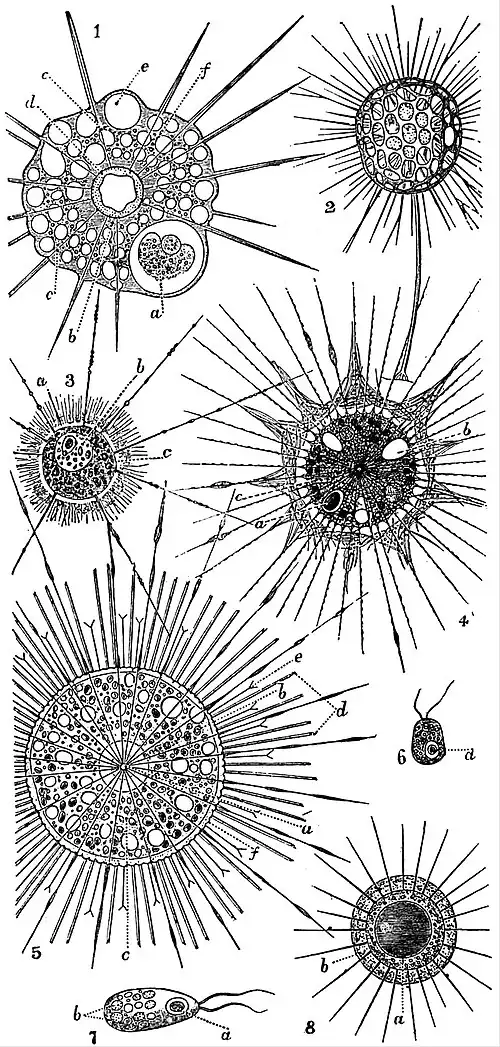 - § 2. Spicules approximated radially. Pinaciophora Greeff, Pompholyxophrys Arch., Lithocolla F. E. Schultze, Elaeorhanis Greeff (in the two foregoing genera the spicules represented by sand granules), Acanthocystis Carter (fig. 1 (5)), Pinacocystis (?) Hertw. and Less, Myriophrys Penard. (Astrodisculus).