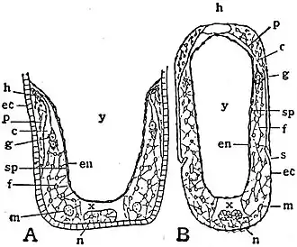 Germinal Layers and Food-Canal.—The embryo begins to develop as an elongate, thickened, ventral region of the blastoderm which is known as the ventral plate or germ band. Along this band a median furrow appears, and a mass of cells sinks within, the one-layered germ band thus becoming transformed into a band of two cell-layers (fig. 15). In some cases the inner layer is formed not by invagination but by proliferation or by delamination. The outer of these two layers (fig. 15, E) is the ectoderm. With regard to the inner layer (endoblast of some authors, fig. 15, M) much difference of opinion has prevailed. It has usually been regarded as representing both endoderm and mesoderm, and the groove which usually leads to its formation has been compared to the abnormally elongated blastopore of a typical gastrula. No doubt can be entertained that the greater part of the inner layer corresponds to the mesoderm of more ordinary embryos, for the coelomic pouches, the germ-cells, the musculature and the vascular system all arise from it. Further, there is general agreement that the chitin-lined fore-gut and hind-gut, which form the greater part of the digestive tract, arise from ectodermal invaginations (stomodaeum and proctodaeum respectively) at the positions of the future mouth and anus. The origin of the mid-gut (mesenteron), that has no chitinous lining in the developed insect, is the disputed point. According to the classical researches of A. Kowalevsky (1871 and 1887) on the embryology of the water-beetle Hydrophilus and of the muscid flies, an anterior and a posterior endoderm-rudiment both derived from the “endoblast” become apparent at an early stage, in close association with the stomodaeum and the proctodaeum respectively. These two endoderm-rudiments ultimately grow together and give rise to the epithelium of the mid-gut. These results were confirmed by the observations of K. Heider and W. M. Wheeler (1889) on the embryos of two beetles—Hydrophilus and Doryphora respectively. V. Graber, however (1889), stated that in the Muscidae, while the anterior endoderm-rudiment arises as Kowalevsky had observed, the posterior part of the “mid-gut” has its origin as a direct outgrowth from the proctodaeum. The recent researches of R. Heymons (1895) on the Orthoptera, and of A. Lécaillon (1898) on various leaf beetles, tend to show that the whole of the “mid-gut” arises from the proliferation of cells at the extremity of the stomodaeum and of the proctodaeum. On this view the entire food-canal in most Hexapoda must be regarded as of ectodermal origin, the “endoblast” represents mesoderm only, and the median furrow whence it arises can be no longer compared with the blastopore. According to Heymons, the yolk-cells must be regarded as the true endoderm in the hexapod embryo, for he states (1897) that in the bristle-tail Lepisma and in dragon-flies they give rise to the mid-gut. These views are not, however, supported by other recent observers. J. Carrière’s researches (1897) on the embryology of the mason bee (Chalicodoma) agree entirely with the interpretations of Kowalevsky and Heider, and so on the whole do those of F. Schwangart, who has studied (1904) the embryonic development of Lepidoptera. He finds that the endoderm arises from an anterior and a posterior rudiment derived from the “endoblast,” that many of the cells of these rudiments wander into the yolk, and that the mesenteric epithelium becomes reinforced by cells that migrate from the yolk. K. Escherich (1901), after a new research on the embryology of the muscid Diptera, claims that the fore and hind endodermal rudiments arise from the blastoderm by invagination, and are from their origin distinct from the mesoderm. On the whole it seems likely that the endoderm is represented in part by the yolk, and in part by those anterior and posterior rudiments which usually form the mesenteron, but that in some Hexapoda the whole digestive tract may be ectodermal. It must be admitted that some or the later work on insect embryology has justified the growing scepticism in the universal applicability of the “germ-layer theory.” Heider has suggested, however, that the apparent origin of the mid-gut from the stomodaeum and proctodaeum may be explained by the presence of a “latent endoderm-group” in those invaginations.