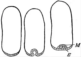 Fig. 15.—Diagram showing Formation of Germinal Layers. E, ectoderm; M, inner layer. Magnified. |