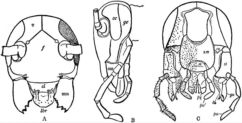 | Fig. 1.—Head and Jaws of Cockroach (Blatta). Magnified 10 times. A, Front; B, side; C, back; v, vertex; f, frons; cl, clypeus; lbr, labrum; oc, compound eye; ge, gena; mn, mandible; ca, st, pa, ga, la, cardo, stipes, palp, galea, lacinia of first maxilla; sm, m, pa′, pg, sub-mentum, mentum, palp, galea of 2nd maxilla. |