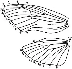 The details of the nervuration vary greatly in the different orders, but J. H. Comstock and J. G. Needham have lately (1898–1899) shown that a common arrangement underlies all, six series of longitudinal or radiating nervures being present in the typical wing (see fig. 5). Along the costa runs a costal nervure. This is followed by a sub-costal which sometimes shows two main branches. Then comes the radial—usually the most important nervure of the wing—typically with five branches, and the median with four. These sets arise from a main trunk towards the front region of the wing-base. From another hinder trunk arise the two-branched cubital nervure and three separate anal nervures. In the hind-wing of many insects the number of radial branches becomes reduced, while the anal area is especially well developed and undergoes a fan-like folding when the wings are closed. Great diversity exists in the texture and functions of fore and hind-wings in different insects; these differences are discussed in the descriptions of the various orders. The wings often afford secondary sexual characters, being not infrequently absent or reduced in the female when well developed in the male (see fig. 6). Rarely the male is the wingless sex.