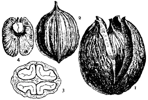 | Fig. 2.—1, Fruit of Carya alba; 2, Hickory Nut; 3, Cross Section of Nut; 4, Vertical Section of the Seed. |