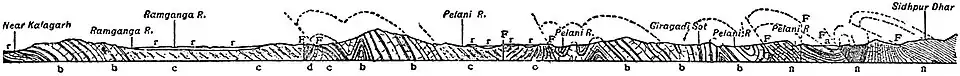 | r = Recent; d = Upper siwalik conglomerate; c = Middle siwalik sandstones; b = Lower (Nahan) siwaliks; a = Nummulitic; n = Older rocks of Himalayas | |