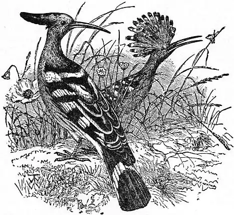 Not a year passes but the hoopoe makes its appearance in some part or other of the British Islands, most often in spring, and if unmolested would doubtless stop to breed in them, and a few instances are known in which it has done so. But its remarkable plumage always attracts attention, and it is generally shot down so soon as it is seen, and before it has time to begin a nest. Eight or nine so-called species of the genus have been described, but of them the existence of five only has been recognized by Sharpe and Dresser (Birds of Europe, pt. vii.). Besides the Upupa epops above treated, these are U. indica, resident in India and Ceylon; U. longirostris, which seems to be the form of the Indo-Chinese countries; U. marginata, peculiar to Madagascar; and U. africana or U. minor of some writers, which inhabits South Africa to the Zambesi on the east and Benguela on the west coast. In habits and appearance they all resemble the best-known and most widely-spread species.[4] (A. N.)