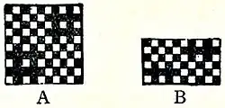 HUCKABACK,[1] the name given to a type of cloth used for towels. For this purpose it has perhaps been more extensively used in the linen trade than any other weave. One of the chief merits of a towel is its capacity for absorbing moisture; plain and other flat-surfaced cloths do not perform this function satisfactorily, but cloths made with huckaback, as well as those made with the honeycomb and similar weaves, are particularly well adapted for this purpose. The body or foundation of the cloth is plain and therefore sound in structure (see designs A and B in figure), but at fixed intervals some of the warp threads float on the surface of the cloth, while at the same time a number of weft threads float on the back. Thus the cloth has a somewhat similar appearance on both sides. Weave A is the ordinary and most used huck or huckaback, while weave B, which is usually woven with double weft, is termed the Devon or medical huck. The cloths made by the use of these weaves were originally all linen, but are too often adulterated with inferior fibres.