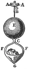 The universal hydrometer of G. Atkins, described in the Phil. Mag. for 1808, xxxi. 254, is merely Nicholson’s hydrometer with the screw at C projecting through the collar into which it is screwed, and terminating in a sharp point above the cup G. To this point soft bodies lighter than water (which would float if placed in the cup) could be attached, and thus completely immersed. Atkins’s instrument was constructed so as to weigh 700 grains, and when immersed to the mark on the stem in distilled water at 60° F. it carried 300 grains in the upper dish. The hydrometer therefore displaced 1000 grains of distilled water at 60° F. and hence the specific gravity of any other liquid was at once indicated by adding 700 to the number of grains in the pan required to make the instrument sink to the mark on the stem. The small divisions on the scale corresponded to differences of 1/10th of a grain in the weight of the instrument.