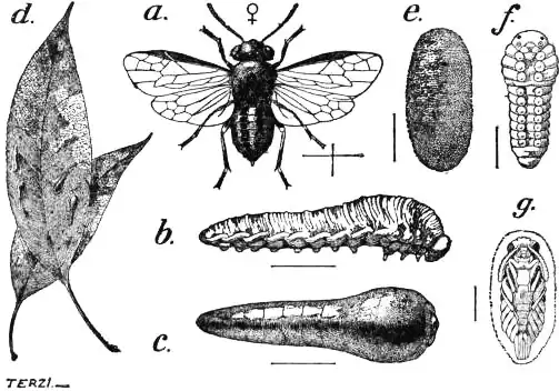 | Fig. 6.—a, Pear Saw-fly (Eriocampoides limacina); b, larva without, and c, with its slimy protective coat; e, cocoon; f, larva before pupation; g, pupa, magnified; d, leaves with larvae. |