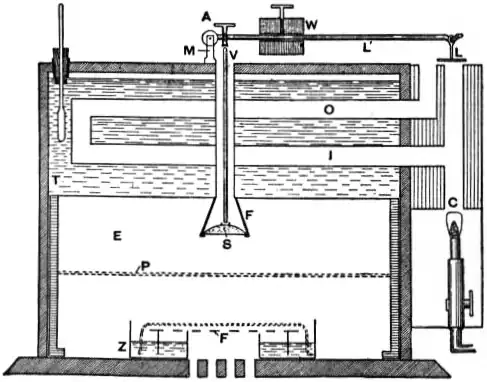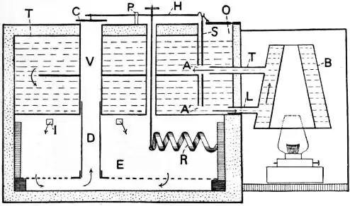 In Schröder’s and Christy’s incubators the hot-water pipes from the boiler simply entered the warm-water tank but did not traverse it. In the two incubators to be next described the hot-water pipes are made to pass through the water in the tank, and are so arranged as to minimize the possibility that the outside of the tank may become colder than the centre. Both of them are also fitted with an ingenious though slightly complex valve for maintaining an approximately constant temperature.