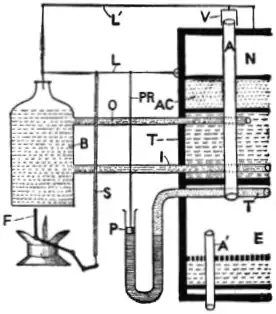 We will first describe those which act through the expansion of a liquid. A very efficient and cheap form is that described by F. J. M. Page in the Journal of the Chemical Society for 1876. The regulator consists of a glass bulb (fig. 15 B), continuous above with a tubular limb (L). At the upper part of the limb is a lateral tubular arm (A) which bends downwards and constitutes the outlet pipe. At the upper extremity of the limb there is a short and much wider tube (T), the lower end of which slides upwards or downwards along it. The upper end of this wider tube is closed by a cork and through a perforation in this a very small glass tube (G) passes downwards into the limb of the regulator to a point a short distance below the exit of the outlet tube. The exact height of the lower aperture of the small tube can be varied by sliding the wider tube up or down along the limb. The by-pass (P) consists of a transverse connexion between the inlet and outlet gas pipes, and the amount of gas which travels through the short circuit thus formed is regulated by means of a stopcock. The by-pass, however, can be formed, as suggested by Schäfer (Practical Histology, 1877, p. 80), by making an extremely small hole in the small inlet tube, a little way above its lower extremity. But unless this hole be small enough, too much gas will be allowed to pass, and a sufficiently low temperature therefore unattainable. The regulator is filled with mercury until the top of the column reaches within 1/2 in. of the exit of the outlet tube, the bulb is placed in the incubator chamber, and gas is allowed to pass through it. By pushing down the inner inlet tube (G) until its aperture is immersed beneath the mercury, the gas supply is cut off, with the exception of that passing through the by-pass. The stopcock is now turned until only the smallest flame exists. The inlet pipe is then raised again above the mercury, and the flame consequently increases in size. The temperature of the incubator gradually rises, and when the desired degree is reached, the inlet tube is pushed down until the end is just beneath the surface of the mercury. The gas supply is thus cut off at the desired temperature. If the temperature of the incubator falls, the mercury contracts, the aperture of the inlet tube is uncovered, the gas supply is renewed and the flame increased. The temperature will then rise until the required point is reached, when the gas supply will again be cut off. A uniform temperature which oscillates within a range of half a degree is thus attained.
