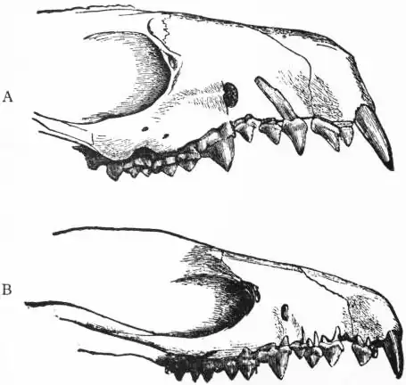| Fig. 7.—Fore-part of Skulls of Common Hedgehog (Erinaceus europaeus), A, and Gray’s Hedgehog (E. grayi), B, much enlarged. |