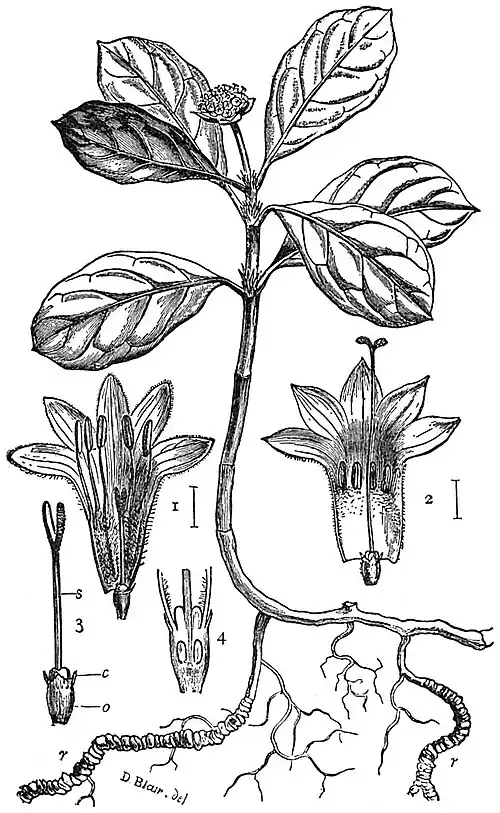 Ipecacuanha Plant (about 1/3 nat. size). 1, 2, Flowers cut open, showing short-styled (1) and long-styled (2) forms; 3, Flower after removal of corolla, showing the inferior ovary (o), the small toothed calyx (c), and the style (s) with its forked stigma; 4, Ovary cut lengthwise showing the two chambers with the basally attached ovules; r, annulated root. |