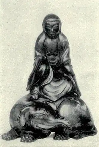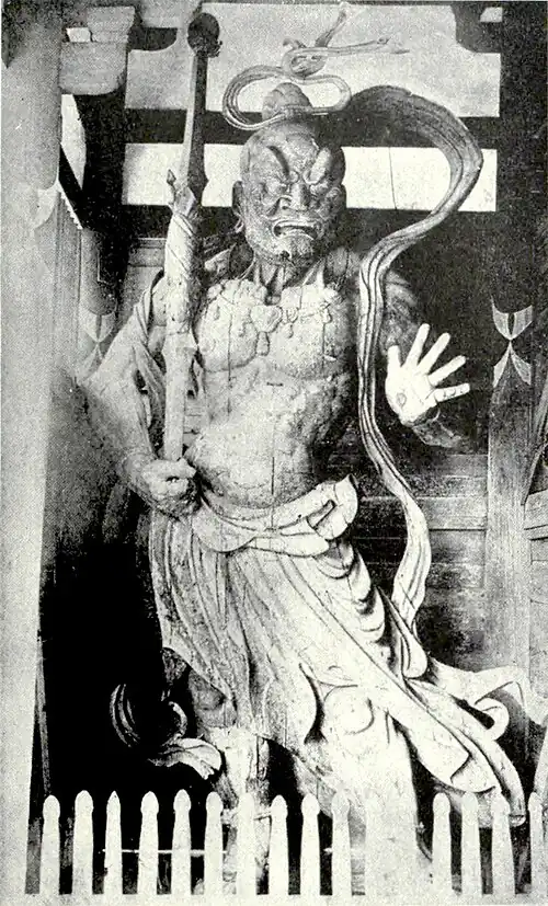 The place of honour may perhaps be conferred upon sculptures in wood, representing the Indian Buddhists, Asangha and Vasabandhu, preserved in the Golden Hall of Kofuku-ji, Nara. These are attributed to a Kamakura sculptor of the 8th or 9th century, and in simple and realistic dignity of pose and grand lines of composition are worthy of comparison with the works of ancient Greece. With these may be named the demon lantern-bearers, so perfect in the grotesque treatment of the diabolical heads and the accurate anatomical forms of the sturdy body and limbs; the colossal temple guardians of the great gate of Tōdai-ji, by Unkei and Kwaikei (11th century), somewhat conventionalized, but still bearing evidence of direct study from nature, and inspired with intense energy of action; and the smaller but more accurately modelled temple guardians in the Saikondo, Nara, which almost compare with the "fighting gladiator" in their realization of menacing strength. The "goddess of art" of Akishino-dera, Nara, attributed to the 8th century, is the most graceful and least conventional of female sculptures in Japan, but infinitely remote from the feminine conception of the Greeks. The wooden portrait of Vimalakirtti, attributed to Unkei, at Kofuku-ji, has some of the qualities of the images of the two Indian Buddhists. The sculptures attributed to Jōchō, the founder of the Nara school, although powerful in pose and masterly in execution, lack the truth of observation seen in some of the earlier and later masterpieces.
