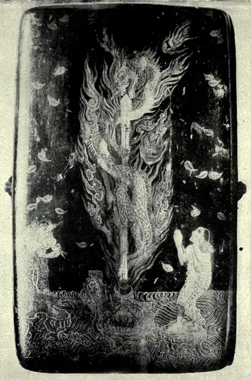 In the manufacture of Japanese lacquer there are three processes. The first is the extraction and preparation of the lac; the second, its application; and the third, the decoration of the lacquered surface. The lac, when taken from an incision in the trunk of the Rhus vernicifera (urushi-no-ki), contains approximately Processes. 70% of lac acid, 4% of gum arabic, 2% of albumen, and 24% of water. It is strained, deprived of its moisture, and receives an admixture of gamboge, cinnabar, acetous protoxide or some other colouring matter. The object to be lacquered, which is generally made of thin white pine, is subjected to singularly thorough and painstaking treatment, one of the processes being to cover it with a layer of Japanese paper or thin hempen cloth, which is fixed by means of a pulp of rice-paste and lacquer. In this way the danger of warping is averted, and exudations from the wooden surface are prevented from reaching the overlaid coats of lacquer. Numerous operations of luting, sizing, lacquering, polishing, drying, rubbing down, and so on, are performed by the nurimono-shi, until, after many days’ treatment, the object emerges with a smooth, lustre-like dark-grey or coloured surface, and is ready to pass into the hands of the makie-shi, or decorator. The latter is an artist; those who have performed the preliminary operations are merely skilled artisans. The makie-shi may be said to paint a picture on the surface of the already lacquered object. He takes for subject a landscape, a seascape, a battle-scene, flowers, foliage, birds, fishes, insects—in short, anything. This he sketches in outline with a paste of white lead, and then, having filled in the details with gold and colours, he superposes a coat of translucid lacquer, which is finally subjected to careful polishing. If parts of the design are to be in relief, they are built up with a putty of black lacquer, white lead, camphor and lamp-black. In all fine lacquers gold predominates so largely that the general impression conveyed by the object is one of glow and richness. It is also an inviolable rule that every part must show beautiful and highly finished work, whether it be an external or an internal part. The makie-shi ranks almost as high as the pictorial artist in Japanese esteem. He frequently signs his works, and a great number of names have been thus handed down during the past two centuries.