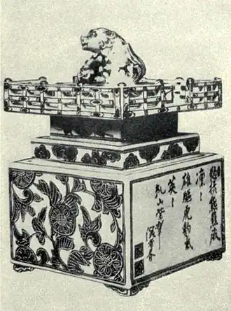 The Owari potters were slow to follow the lead of Miyagawa Shōzan and Seifū Yōhei. At the industrial exhibition in Kiōto (1895) the first results of their efforts were shown, attracting attention at once. In medieval times Owari was celebrated for faience glazes of various colours, Ware of Owari. much affected by the tea-clubs, but its staple manufacture from the beginning of the 19th century was porcelain decorated with blue under the glaze, the best specimens of which did not approach their Chinese prototypes in fineness of pâte, purity of glaze or richness of colour. During the first twenty-five years of the Meiji era the Owari potters sought to compensate the technical and artistic defects of their pieces by giving them magnificent dimensions; but at the Tōkyō industrial exhibition (1891) they were able to contribute some specimens showing decorative, plastic and graving skill of no mean order. Previously to that time, one of the Seto experts, Katō Gosuke, had developed remarkable ability in the manufacture of céladon, though in that field he was subsequently distanced by Seifū of Kiōto. Only lately did Owari feel the influence of the new movement towards Chinese types. Its potters took flambé glazes for models, and their pieces possessed an air of novelty that attracted connoisseurs. But the style was not calculated to win general popularity, and the manufacturing processes were too easy to occupy the attention of great potters. On a far higher level stood egg-shell porcelain, remarkable examples of which were sent from Seto to the Kiōto industrial exhibition of 1895. Chinese potters of the Yung-lo era (1403–1414) enriched their country with a quantity of ware to which the name of totai-ki (bodiless utensil) was given on account of its wonderfully attenuated pâte. The finest specimens of this porcelain had incised decoration, sparingly employed but adding much to the beauty of the piece. In subsequent eras the potters of King-te-chen did not fail to continue this remarkable manufacture, but its only Japanese representative was a porcelain distinctly inferior in more than one respect, namely, the egg-shell utensils of Hizen and Hirado, some of which had finely woven basket-cases to protect their extreme fragility. The Seto experts, however, are now making bowls, cups and vases that rank nearly as high as the celebrated Yung-lo totai-ki. In purity of tone and velvet-like gloss of surface there is distinct inferiority on the side of the Japanese ware, but in thinness of pâte it supports comparison, and in profusion and beauty of incised decoration it excels its Chinese original.