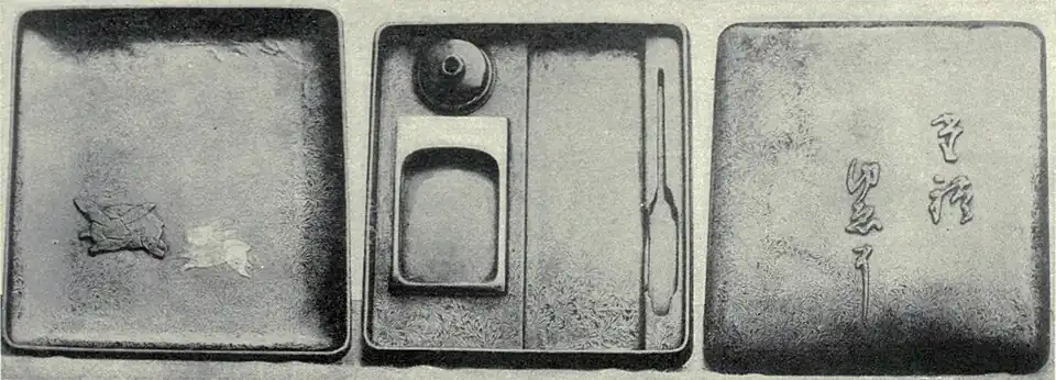 | Fig 14.—DOOR OF BRONZE LANTERN IN THE TODAI TEMPLE (8th century). | Fig. 17.—INKSTONE BOX IN LACQUER. By Koyetsu (1557–1637). | |||