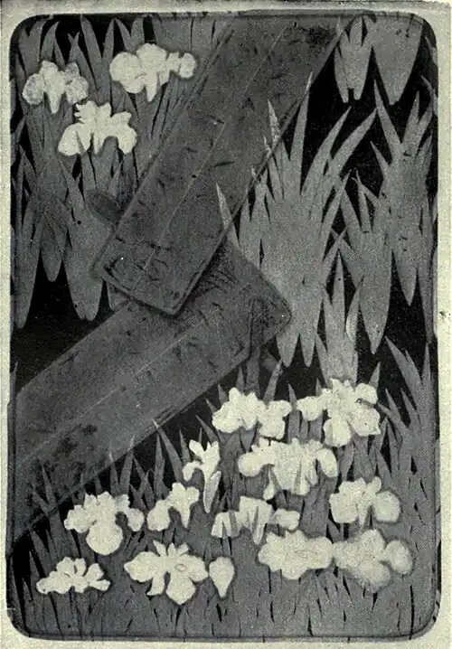 The only branch of the lacquerer’s art that can be said to have shown any marked development in the Meiji era is that in which parts of the decorative scheme consist of objects in gold, silver, shakudo, shibuichi, iron, or, above all, ivory or mother-of-pearl. It might indeed be inferred, from some of New Development. the essays published in Europe on the subject of Japan’s ornamental arts, that this application of ivory and mother-of-pearl holds a place of paramount importance. Such is not the case. Cabinets, fire-screens, plaques and boxes resplendent with gold lacquer grounds carrying elaborate and profuse decoration of ivory and mother-of-pearl[3] are not objects that appeal to Japanese taste. They belong essentially to the catalogue of articles called into existence to meet the demand of the foreign market, being, in fact, an attempt to adapt the lacquerer’s art to decorative furniture for European houses. On the whole it is a successful attempt. The plumage of gorgeously-hued birds, the blossoms of flowers (especially the hydrangea), the folds of thick brocade, microscopic diapers and arabesques, are built up with tiny fragments of iridescent shell, in combination with silver-foil, gold-lacquer and coloured bone, the whole producing a rich and sparkling effect. In fine specimens the workmanship is extraordinarily minute, and every fragment of metal, shell, ivory or bone, used to construct the decorative scheme, is imbedded firmly in its place. But in a majority of cases the work of building is done by means of paste and glue only, so that the result lacks durability. The employment of mother-of-pearl to ornament lacquer grounds dates from a period as remote as the 8th century, but its use as a material for constructing decorative designs began in the 17th century, and was due to an expert called Shibayama, whose descendant, Shibayama Sōichi, has in recent years been associated with the same work in Tōkyō.