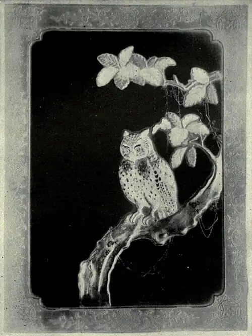 Inlaying with gold or silver was among the early forms of decoration in Japan. The skill developed in modern times is at least equal to anything which the past can show, and the results produced are much more imposing. There are two principal kinds of inlaying: the first called hon-zōgan (true Inlaying. inlaying), the second nunome-zōgan (linen-mesh inlaying). As to the former, the Japanese method does not differ from that seen in the beautiful iron censers and vases inlaid with gold which the Chinese produced from the Süen-tē era (1426–1436). In the surface of the metal the workman cuts grooves wider at the base than at the top, and then hammers into them gold or silver wire. Such a process presents no remarkable features, except that it has been carried by the Japanese to an extraordinary degree of elaborateness. The nunome-zōgan is more interesting. Suppose, for example, that the artist desires to produce an inlaid diaper. His first business is to chisel the surface in lines forming the basic pattern of the design. Thus, for a diamond-petal diaper the chisel is carried across the face of the metal horizontally, tracing a number of parallel bands divided at fixed intervals by ribs which are obtained by merely straightening the chisel and striking it a heavy blow. The same process is then repeated in another direction, so that the new bands cross the old at an angle adapted to the nature of the design. Several independent chisellings may be necessary before the lines of the diaper emerge clearly, but throughout the whole operation no measurement of any kind is taken, the artist being guided entirely by his hand and eye. The metal is then heated, not to redness, but sufficiently to develop a certain degree of softness, and the workman, taking a very thin sheet of gold (or silver), hammers portions of it into the salient points of the design. In ordinary cases this is the sixth process. The seventh is to hammer gold into the outlines of the diaper; the eighth, to hammer it into the pattern filling the spaces between the lines, and the ninth and tenth to complete the details. Of course the more intricate the design the more numerous the processes. It is scarcely possible to imagine a higher effort of hand and eye than this nunome-zōgan displays, for while intricacy and elaborateness are carried to the very extreme, absolute mechanical accuracy is obtained. Sometimes in the same design we see gold of three different hues, obtained by varying the alloy. A third kind of inlaying, peculiar to Japan, is sumi-zōgan (ink-inlaying), so called because the inlaid design gives the impression of having been painted with Indian ink beneath the transparent surface of the metal. The difference between this process and ordinary inlaying is that for sumi-zōgan the design to be inlaid is fully chiselled out of an independent block of metal with sides sloping so as to be broader at the base than at the top. The object which is to receive the decoration is then channelled in dimensions corresponding to those of the design block, and the latter having been fixed in the channels, the surface is ground and polished until an intimate union is obtained between the inlaid design and the metal forming its field. Very beautiful effects are thus produced, for the design seems to have grown up to the surface of the metal field rather than to have been planted in it. Shibuichi inlaid with shakudo used to be the commonest combination of metals in this class of decoration, and the objects usually depicted were bamboos, crows, wild-fowl under the moon, peony sprays and so forth.